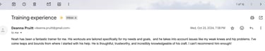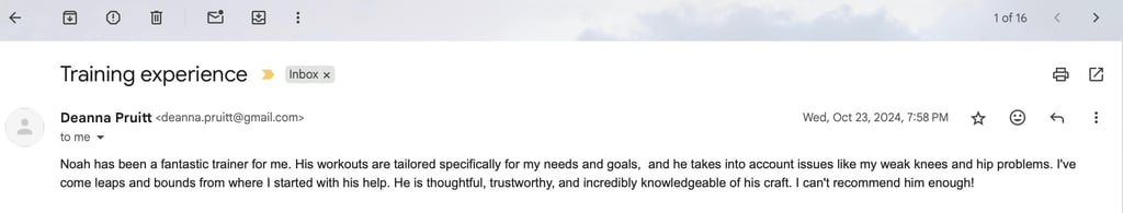 "I would definitely recommend Noah for your fitness journey. He is knowledgeable in body mechanics & nutrition. I’m a 63 year old woman who has been a dancer and runner all my life. Noah was patient and encouraging as I started strength training. He is very professional, and he is extremely dedicated to his clients."