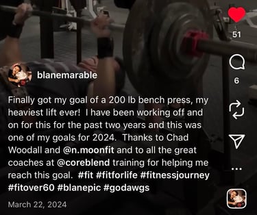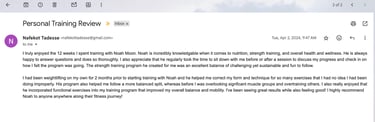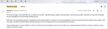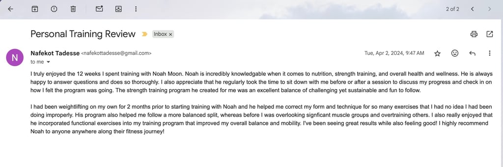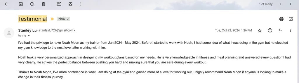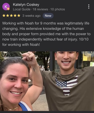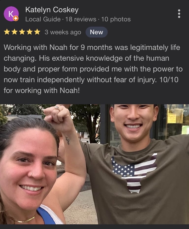 "I am Loren, and I had the pleasure of working with Noah Moon as my trainer from late 2023 to early 2024. Noah was not only professional and athletic but also incredibly friendly and supportive, with expertise in both physical training and nutrition. Since completing our sessions, I’ve seen significant improvements in my strength and form, as well as a positive transformation in my eating habits and lifestyle. I truly appreciate the impact he’s had on my health and well-being."
